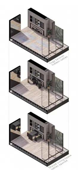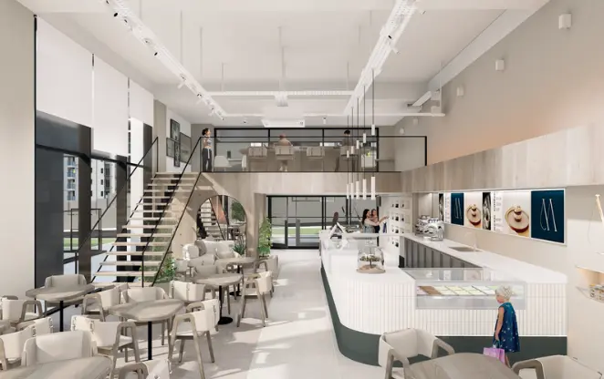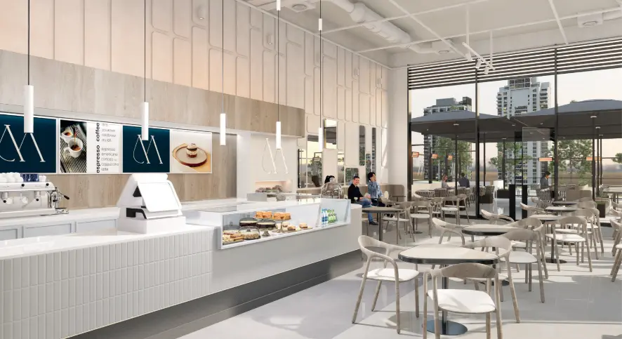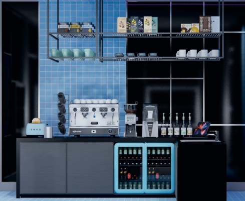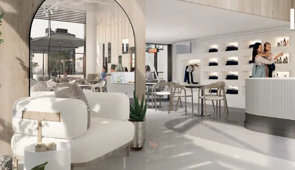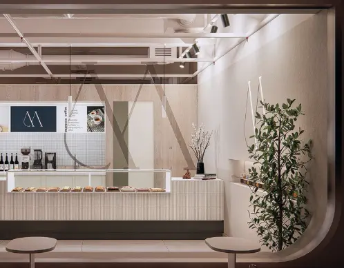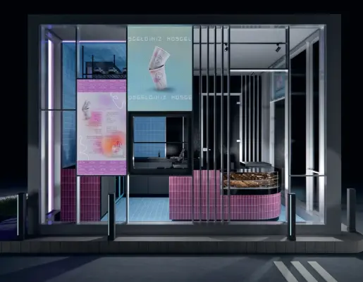 Mekanda sıcak ahşap detaylar ve metal armatürler dikkat çekmektedir. Entegre oturma köşeleri ve modüler mobilyalar, mekanın işlevselliğini artırırken müşteri ihtiyaçlarına uyum sağlamaktadır. Stratejik olarak yerleştirilmiş tezgah bölümü ise görsel bir merkez olarak tasarımı tamamlamaktadır.