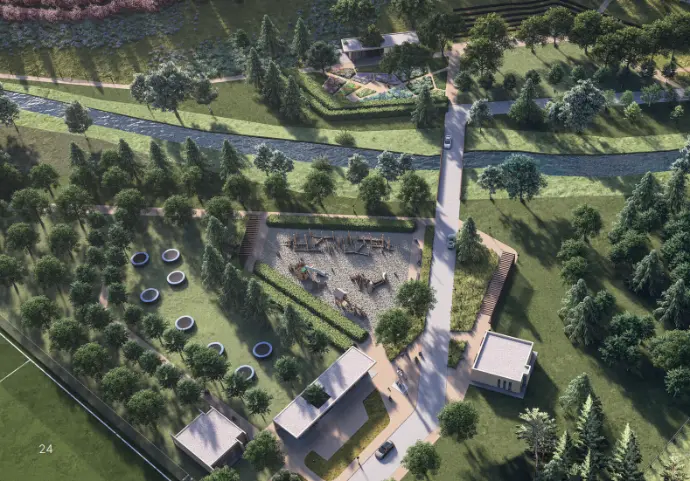Park, açık çimenlik alanlar, ormanlık bölgeler ve su ögeleri dahil olmak üzere çeşitli manzaralar arasında dolaşan bir yürüme ve bisiklet yolları ağı ile düzenlenmiştir. Park içerisinde, topluluk etkinlikleri için bir toplanma ve sergi alanı, restoran, çocukları yaratıcı oyunlara teşvik edecek bir oyun alanı, doğa okulu, oturma ve barbekü olanaklarıyla donatılmış piknik alanları ve spor sahaları yer almaktadır.