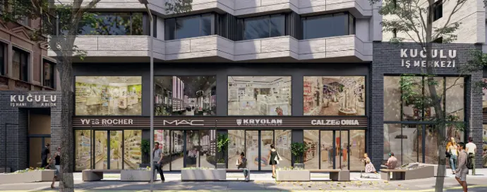Girişler yeniden tasarlanmış ve mağazaların ortak bir dilde bütüncül bir şekilde yer almasına özen gösterilmiştir. Kamusal alan ile bağ kuran modüler kentsel mobilyalar dinlenme alanları, aydınlatmalar ve yeşil alanları tanımlamaktadır.
