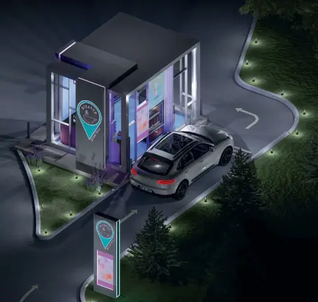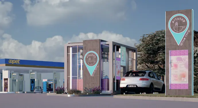 Kütlenin cephesine kontrast oluşturacak şekilde canlı renklerde seramikler ve neon aydınlatmalarla tasarlanmış iç mekanı, yoldan geçen araçlar için dikkat çekici bir durak tanımlamaktadır.