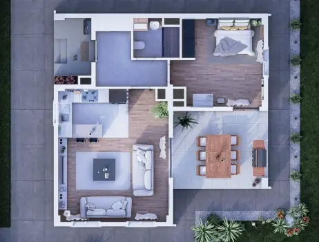 Ferah ve açık planlı bir salon ve mutfak dikkat çekmektedir. Mutfak, salona entegre edilmiş olup, sosyal etkileşimi artırmayı amaçlar.